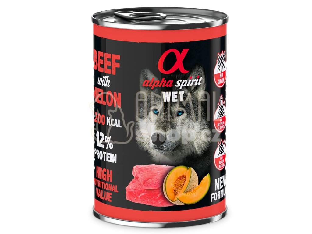 Konzerva Alpha Spirit plná čerstvého hovězího masa s melounem pro všechny dospělé psy.