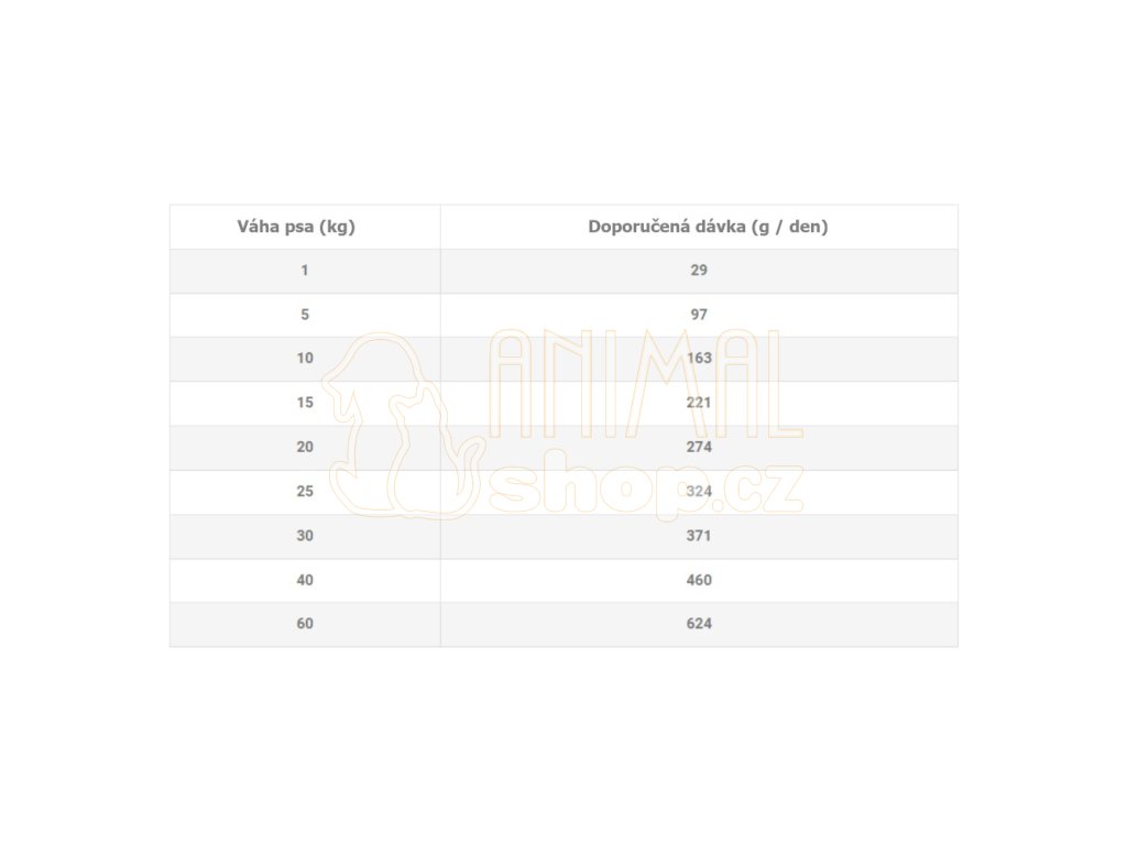 Analytické složky: Hrubý protein 26 %, Hrubý tuk 16 %, Omega mastné kyseliny 3 0,30 %, Omega mastné kyseliny 6 3 %, Hrubá vláknina 3 %, Hrubý popel 8 %, Vápník 1,60 %, Fosfor 1,20 %.