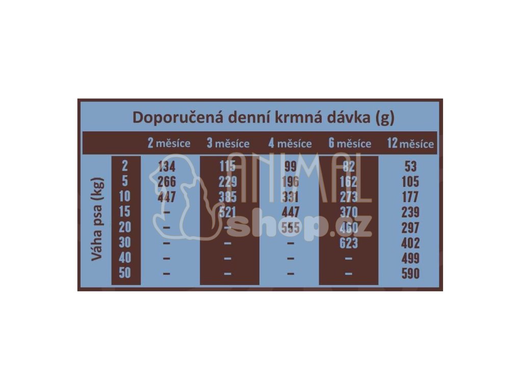 Jediný zdroj živočišných bílkovin - monoproteinová strava výrazně snižuje riziko vzniku intolerancí a potravinových alergií. Receptura je připravena s použitím čerstvého masa nejvyšší kvality. Receptura s prémiovými přísadami tvoří základ pro perfektní růst a vývoj kostí a svalů. Správná rovnováha vápníku a fosforu napomáhá vývoji kostí a kloubů u rostoucích štěňat. Zinek a vitamín A pomáhají udržovat kůži a srst zdravou a lesklou. Prebiotika (FOS & MOS) podporují růst střevní flóry, která zlepší trávení a vstřebávání živin. EPA + DHA podporují správný rozvoj zraku a nervového systému.