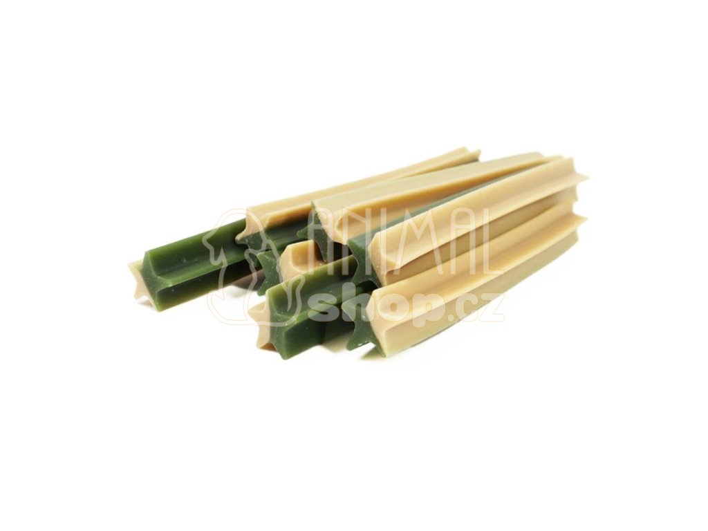 Dentální pamlsek ve tvaru dvoubarevné tyče. S propolisem, slaninou a s chlorofylem ze špenátu