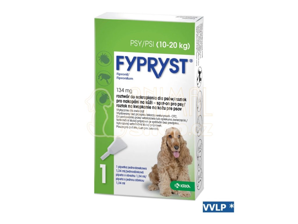 Dávkování a způsob podání: Dávkování Fypryst 134 mg spot-on pro psy - Jedna jednodávková pipeta o obsahu 1,34 ml roztoku pro nakapání na kůži - spot-on pro psa vážícího od 10 kg až do 20 kg živé hmotnosti. Takto zajistíte minimální doporučenou dávku fipronilu 6,7 mg / kg. Vzhledem k absenci studií týkajících se bezpečnosti přípravku je minimální léčebný interval 4 týdny. Měsíční léčba se doporučuje v případě vysokého rizika opakovaného napadení blechami, pokud je pes alergický na bleší kousnutí, v případě nutnosti kontroly napadení klíšťaty nebo při častém koupání psa za použití hypoalergenních nebo zvláčňujících šamponů. V oblastech, kde nehrozí vážné napadení blechami a klíšťaty, může být přípravek Fypryst spot-on aplikován každé dva až tři měsíce.