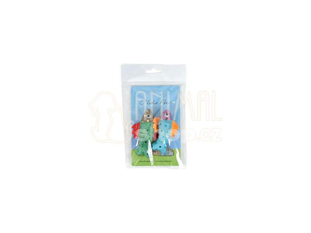 Hračka pro kočky se šantou v podobě rybky s třpytkami v různých barvách.
