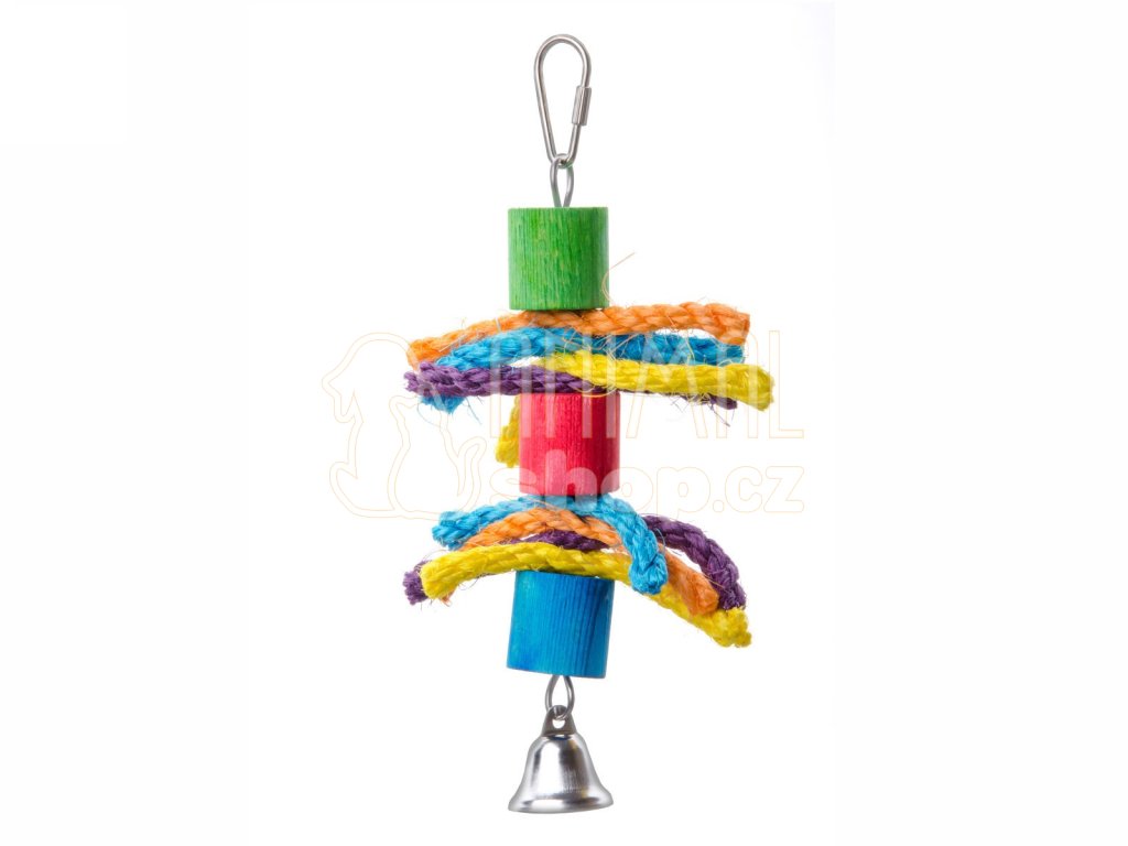 Hračka pro ptáky dřevěné válce s provázky s kovovým závěsem, díky kterému se snadno připevní do klece. Hračka je určena zejména pro střední papoušky. Někteří papoušci se mohou nové hračky bát. V takovém případě doporučujeme seznamovat papouška s novou hračkou pomalu a zpočátku ji nechat zavěšenou například zvenku na kleci, aby si na ni mohl papoušek pomalu zvyknout.
