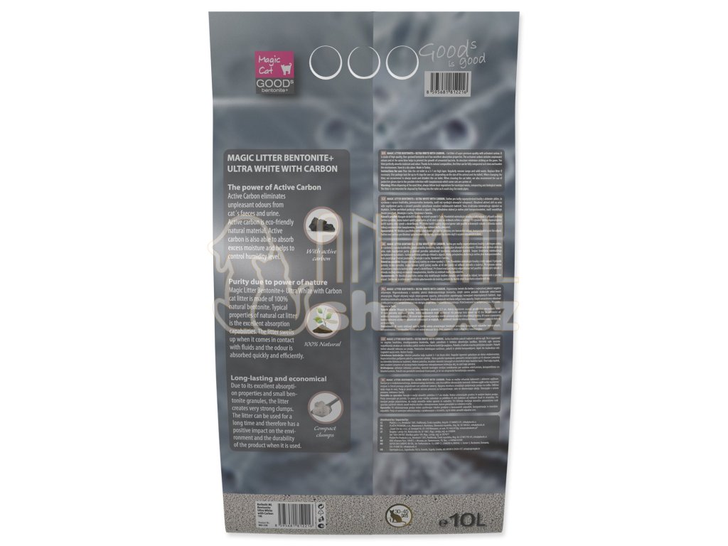 Stelivo pro kočky superprémiové kvality s aktivním uhlím. Je vyrobeno z vysoce kvalitního, jemnozrnného bentonitu, tudíž má vynikající absorpční schopnosti.