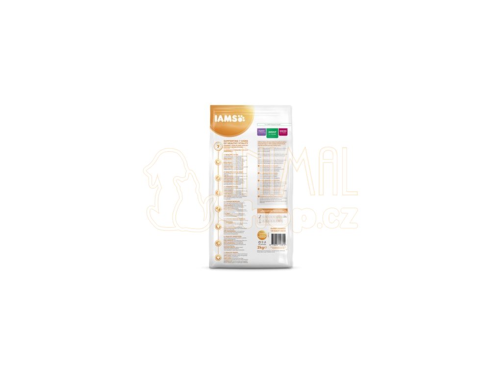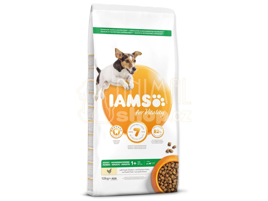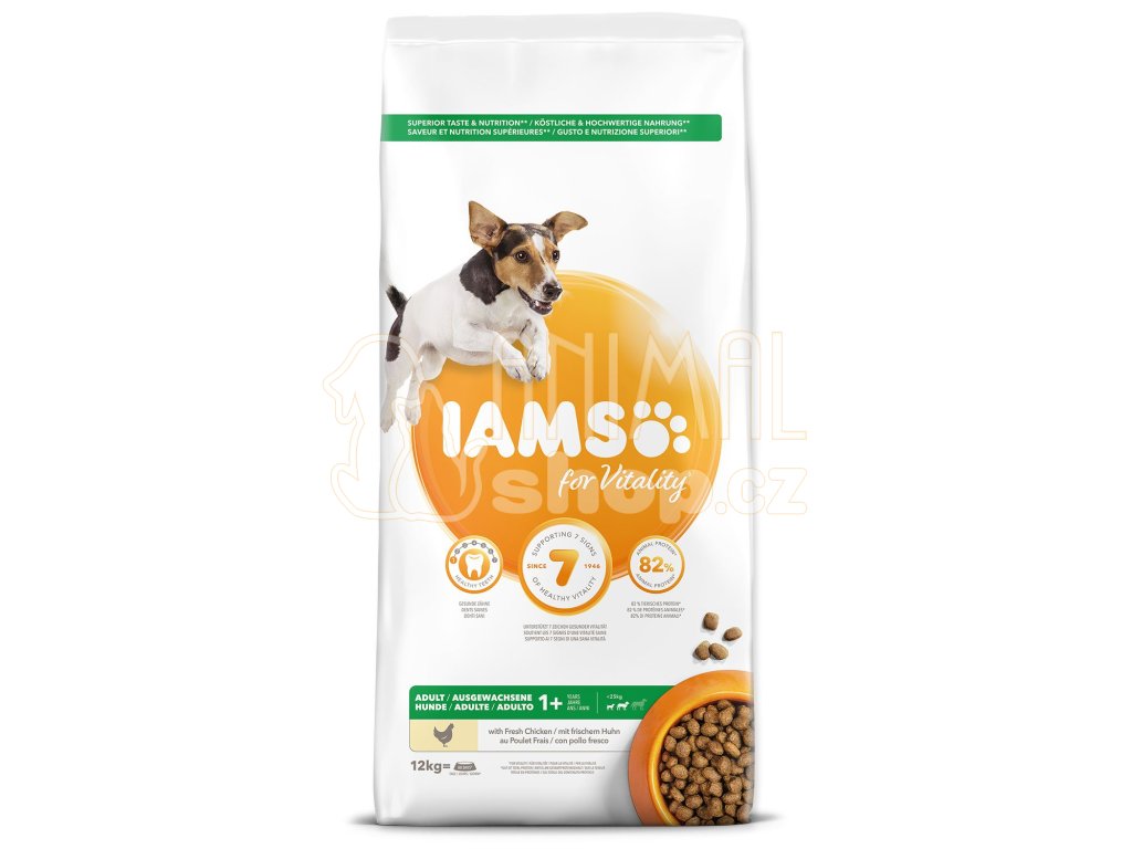 Krmivo IAMS for Vitality pro dospělé psy malých a středních plemen je 100% kompletní a vyvážené odborníky sestavené krmivo, které bude vašemu zvířeti chutnat a svědčit. Naše nová a vylepšená receptura pro dospělé psy s čerstvým kuřecím masem je založena na kvalitních živočišných bílkovinách, které byly pečlivě vybrány, aby podporovaly sedm znaků zdravé vitality psa. Aby byl váš pes zdravý, aktivní a plný energie, obsahují naše lahodné receptury až 82 % živočišných bílkovin (z celkového obsahu bílkovin).