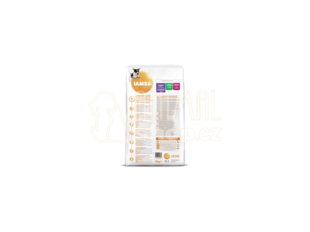 Krmivo IAMS for Vitality pro štěňata malých a středních plemen je 100% kompletní a vyvážené odborníky sestavené krmivo, které bude vašemu štěněti svědčit. Naše nová a vylepšená receptura pro štěňata s čerstvým kuřecím masem je založena na kvalitních živočišných bílkovinách, které byly pečlivě vybrány, aby podporovaly sedm znaků zdravé vitality štěněte. Aby byla štěňata zdravá, aktivní a plná energie, obsahují naše lahodné receptury až 85 % živočišných bílkovin z kuřecího masa (z celkového obsahu bílkovin).