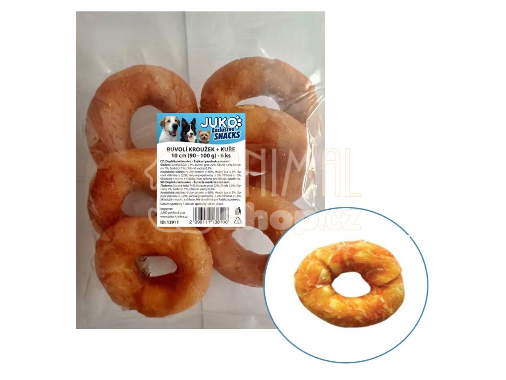 Skvělá pochoutka, která uspokojuje přirozenou touhu a potřebu žvýkat. Kroužky jsou z tvrdé bůvolí kůže, což při žvýkání napomáhá udržovat zuby silné a zdravé. Delikatesní chuť zajistí sušené kuřecí maso.
