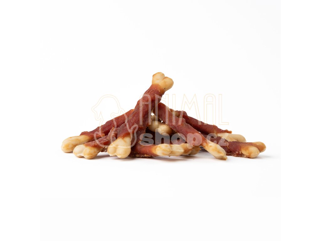 Přírodní masová pochoutka pro psy. Proužek kachní svaloviny namotaný na křupavé kalciové kosti