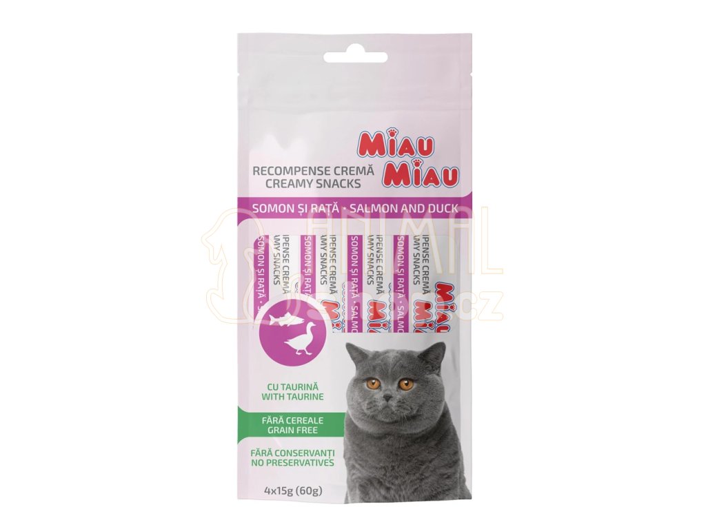 MIAU MIAU smetanová svačinka pro kočky s lososem a kachním masem.