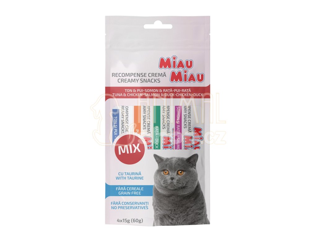 MIAU MIAU smetanové svačiny pro kočky ve 4 příchutích.