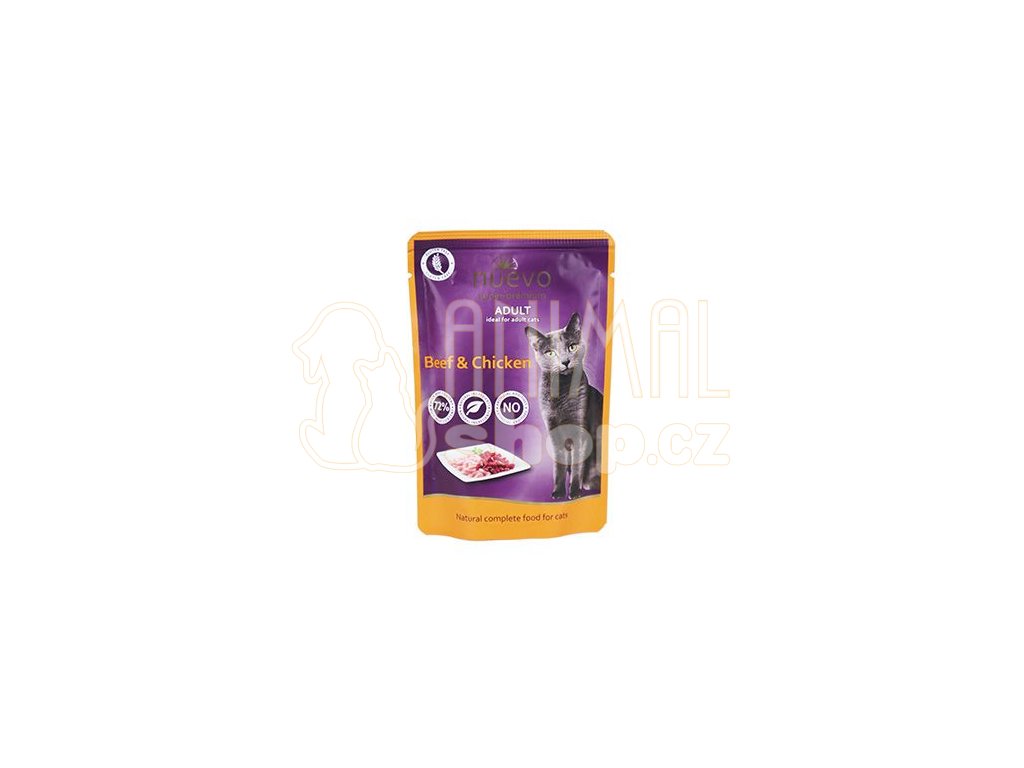 Kočičí kapsa Nuevo Adult kuře a hovězí je kompletní krmivo pro dospělé kočky všech plemen s kuřecím a hovězím masem. Díky vysokému obsahu masa a přírodních surovin a žádnému obsahu umělých přísad, obilí a lepku patří toto krmivo do vysoce kvaliního a i ta nejvybíravější kočička si jej určitě zamiluje!