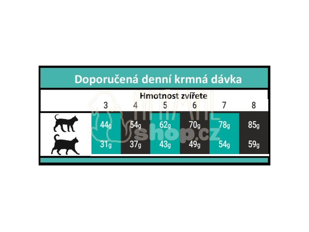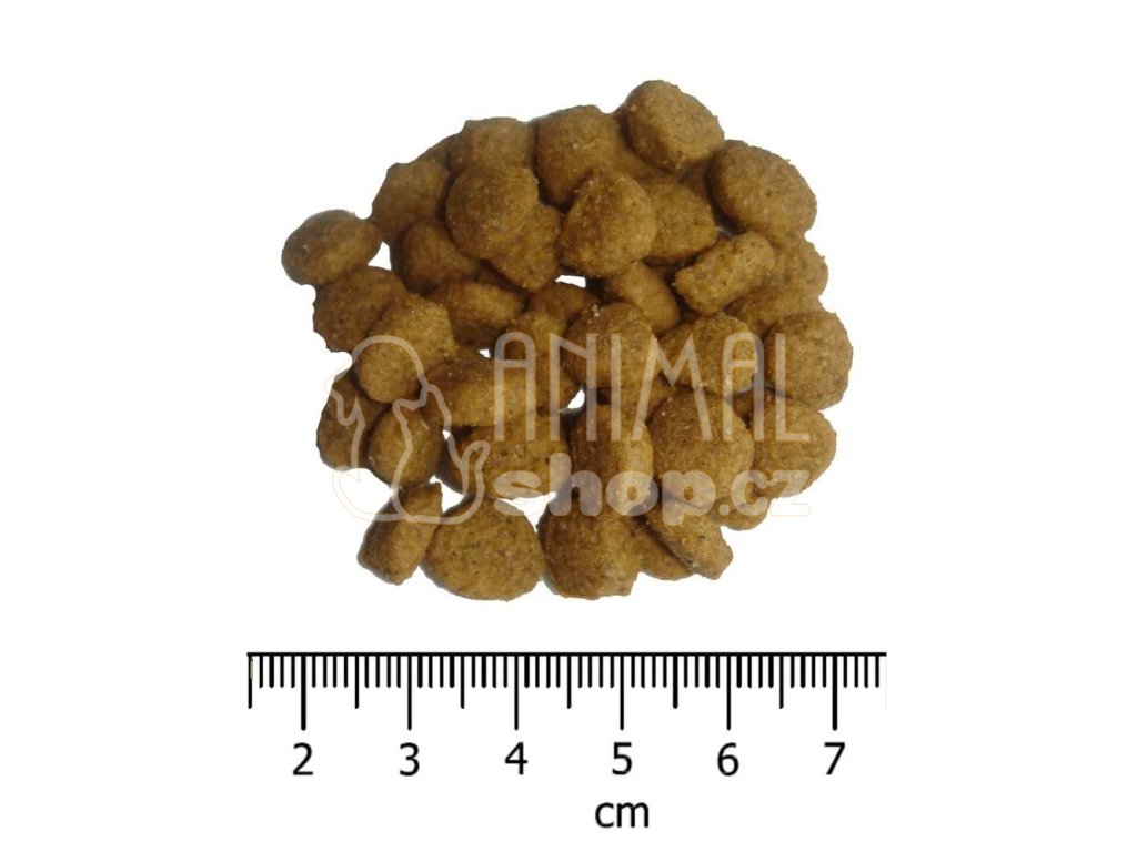 Analytické složky: Hrubý protein 37 %, hrubý olej a tuky 11 %, omega-3 mastné kyseliny 0,20 %, omega-6 mastné kyseliny 2,00 %, hrubá vláknina 6,00 %, hrubý popel 8,00 %, vápník 2,20 %, fosfor 1,60 %. Metabolizovatelná energie 3546 kcal/kg.