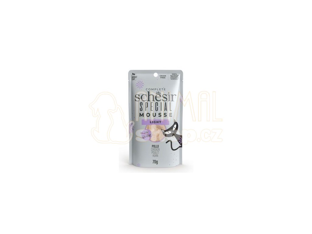 Schesir Special je kompletní a vyvážená výživa, bez obilovin. Receptura speciálně vytvořená pro kočky se sklonem k nadváze, s nižším příjmem kalorií než jiné pěny Schesir pro dospělé kočky, na bázi pravého kuřecího masa s přídavkem krůtího masa smíchaného do jemné a sametové pěny.