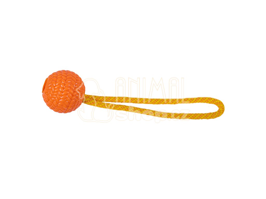 Míč z tvrdé gumy TRP se šňůrou je ideální pro všechny psy, kteří milují aportování i přetahování.