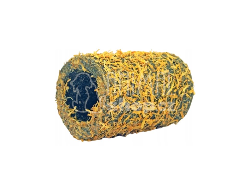 Bylinková pochoutka pro hlodavce s měsíčkem ve tvaru dutého tunelu na roli.