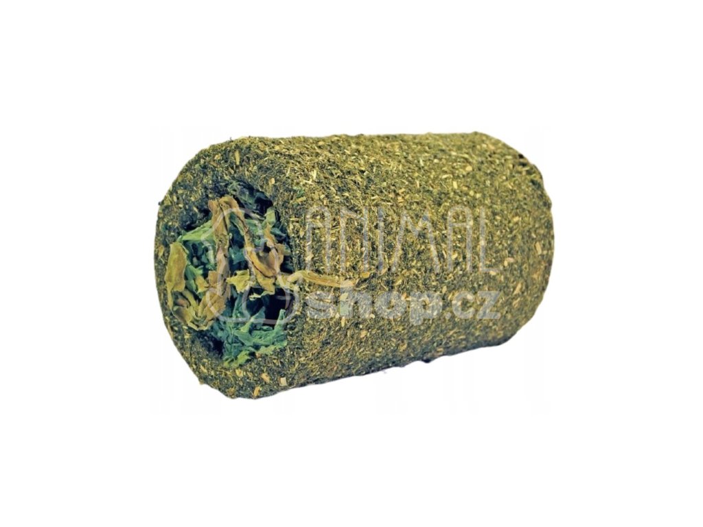 Vojtěšková pochoutka pro hlodavce ve tvaru plněného tunelu na roli s bylinkami a semínky.
