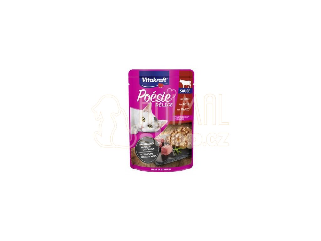 Poésie Délice Sauce s hovězím masem od značky Vitakraft – kompletní mokré krmivo pro dospělé jedince. Kapsička potěší vašeho mazlíčka, ať už je jakéhokoliv plemena či velikosti. Uvnitř nenajdete žádný cukr, ani obiloviny. Zato obsahuje poctivou porci kousků šťavnatého masa a minerálních látek. Díky lahodné omáčce zachutná každé kočce.