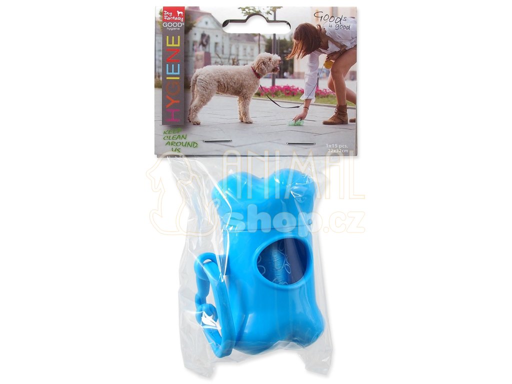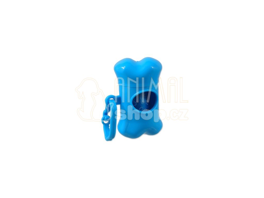 Plastový zásobník s úchytem na vodítko ve tvaru kosti + 2 role sáčků na výkaly.