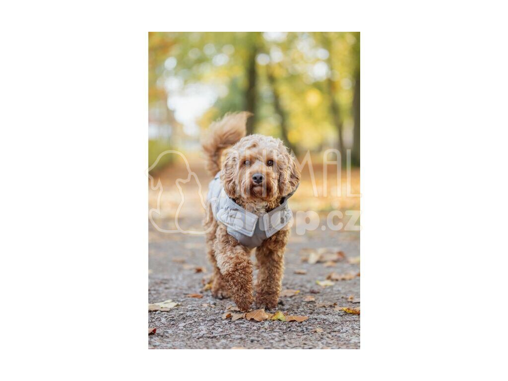Bunda z odolného nepromokavého nylonu a reflexním lemováním. S extra vysokým límcem se stahovací šňůrkou. Obvod hrudníku 36–64 cm. Délka: 30 cm.